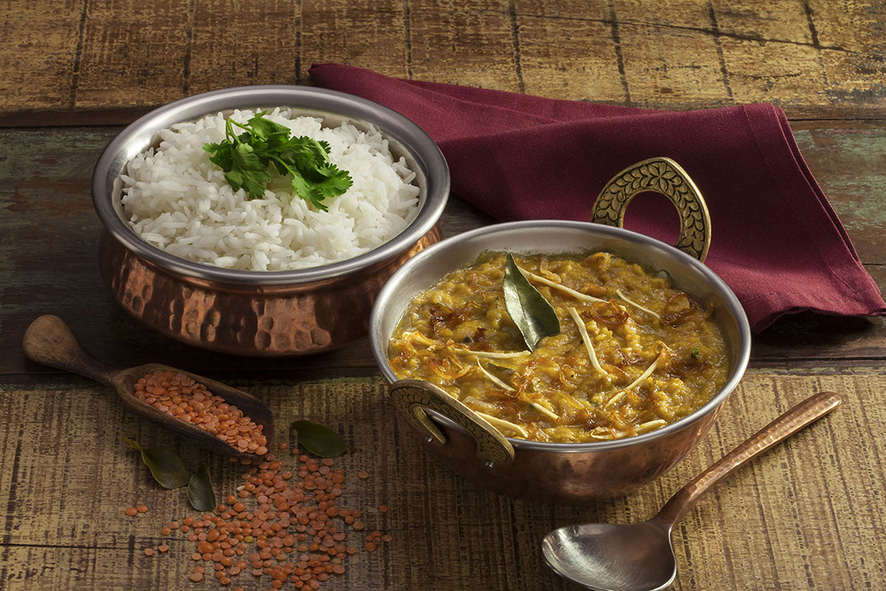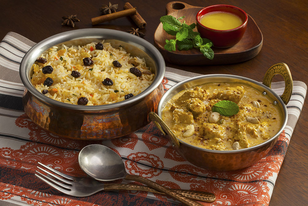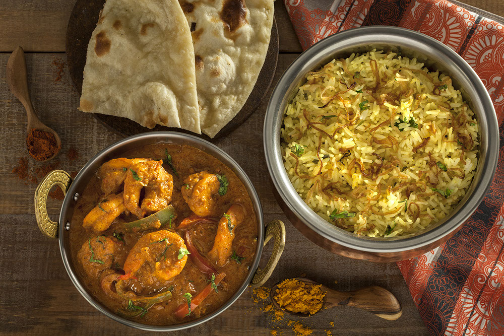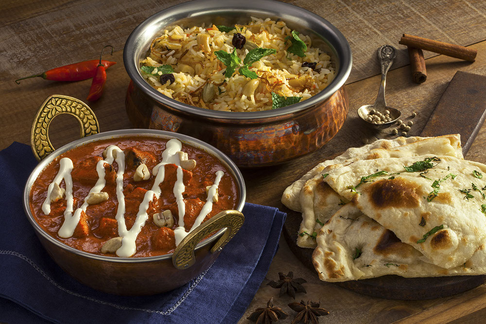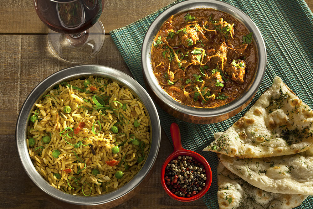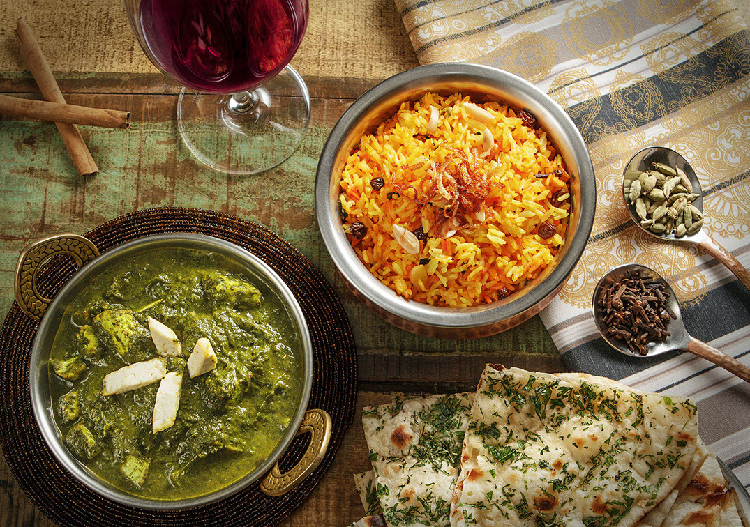 São servidos pratos indianos preparados com vinte e cinco tipos de especiarias, como gengibre, açafrão, cravo, canela, anis estrelado, cardamomo e hortelã. Além, é lógico, dos diferentes tipos de pimenta, ou mirch, como é chamada em hindi, empregadas de muitas maneiras, variando em sabor e intensidade, e das muitas misturas tradicionais, chamadas "masalas", como o curry, por exemplo.
