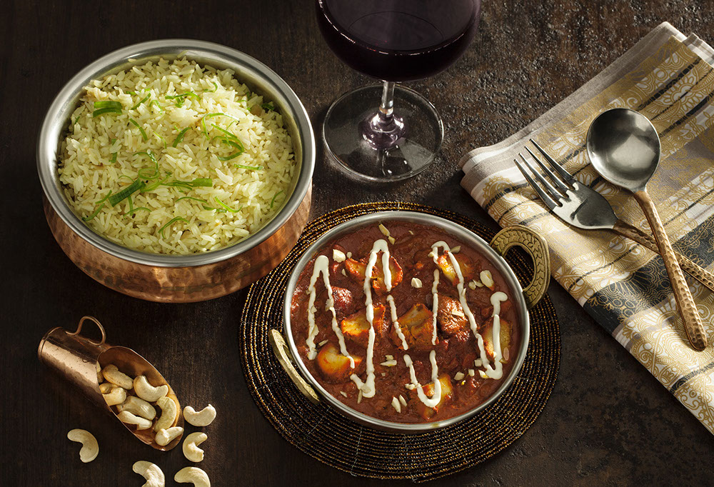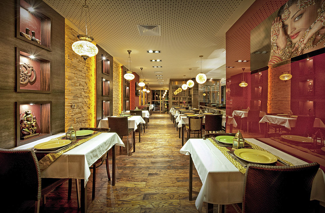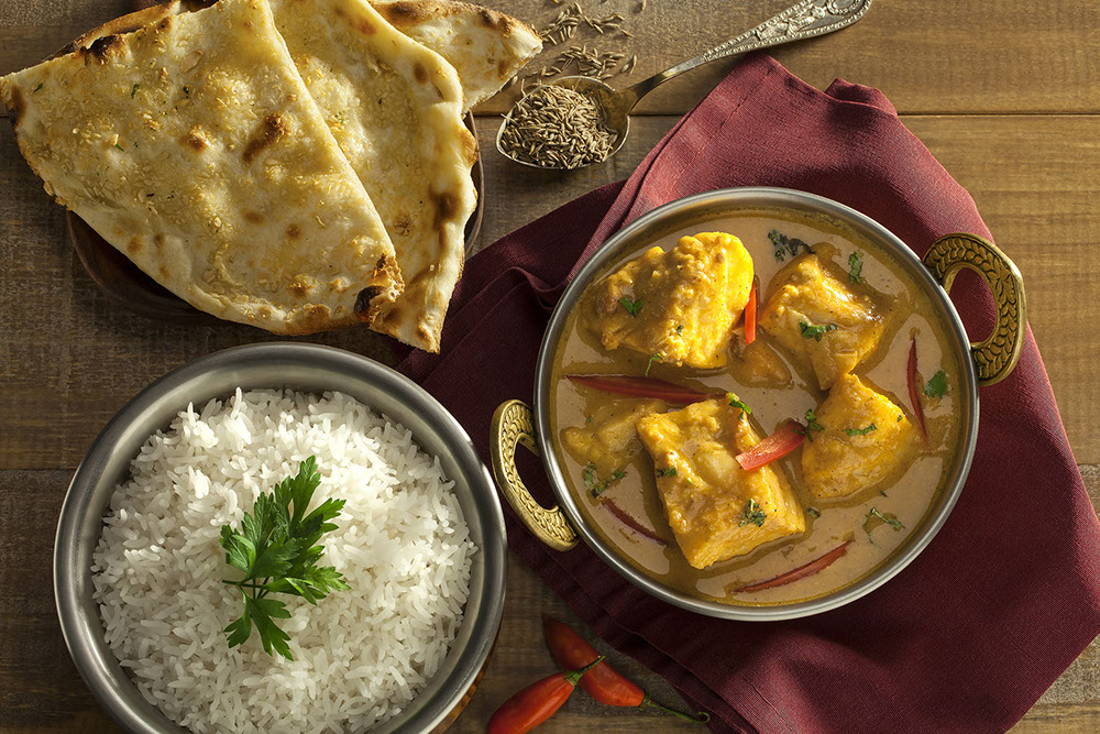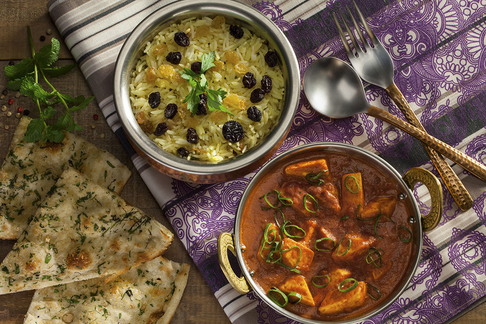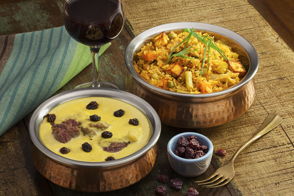 São servidos pratos indianos preparados com vinte e cinco tipos de especiarias, como gengibre, açafrão, cravo, canela, anis estrelado, cardamomo e hortelã. Além, é lógico, dos diferentes tipos de pimenta, ou mirch, como é chamada em hindi, empregadas de muitas maneiras, variando em sabor e intensidade, e das muitas misturas tradicionais, chamadas "masalas", como o curry, por exemplo.